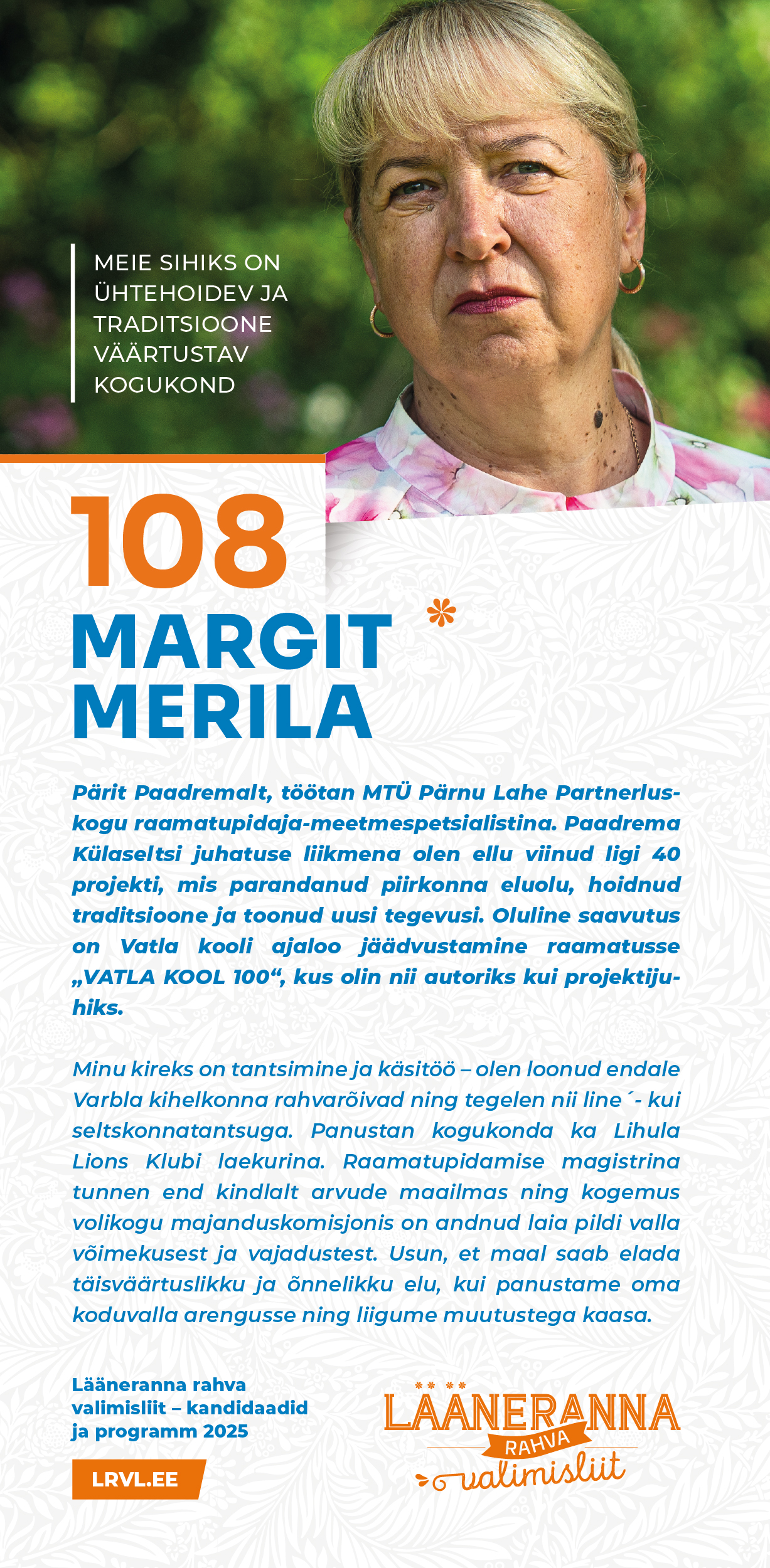Olen veendunud, et Lääneranna tugevus peitub just kogukondade mitmekesisuses. Kui hoiame iga kogukonna eripära, aga õpime üksteiselt ja tegutseme koos, on kogu vald tugevam ja ühtsem.